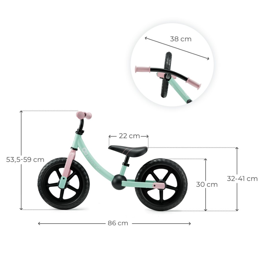 Bicikl je opremljen novim i poboljšanim EVA točkovima, kao i podesivim upravljačem i sjedištem, kako bi se prilagodio rastu djeteta. Zahvaljujući laganom i ergonomskom okviru, jednostavan je za upravljanje i nošenje.